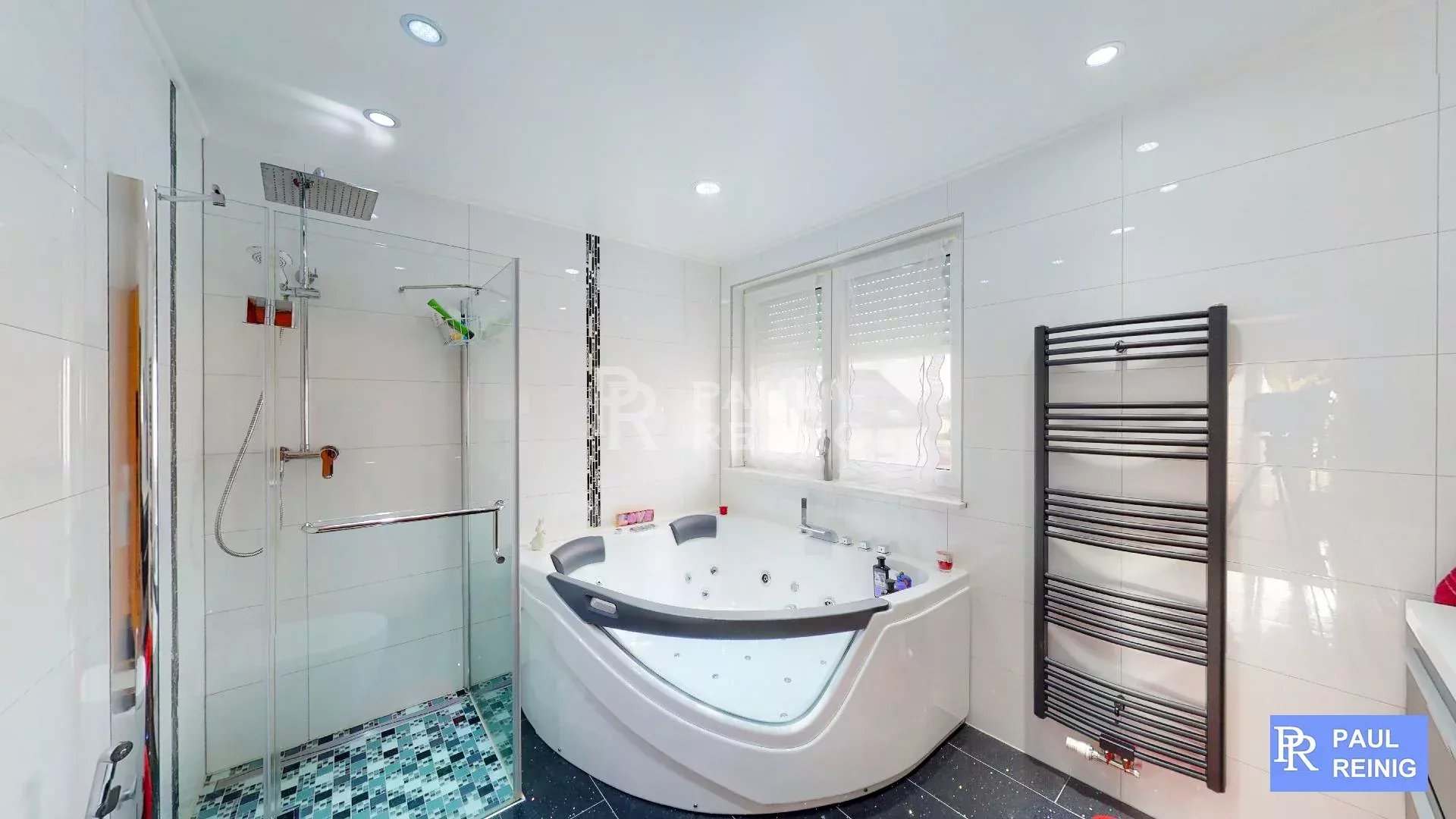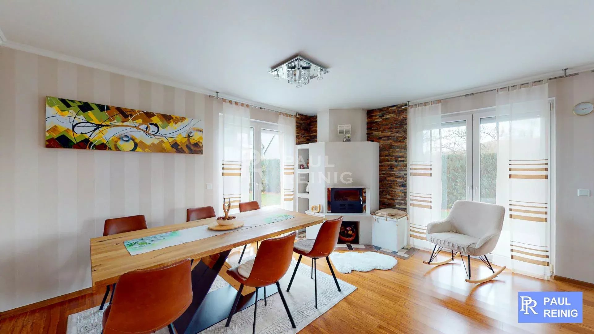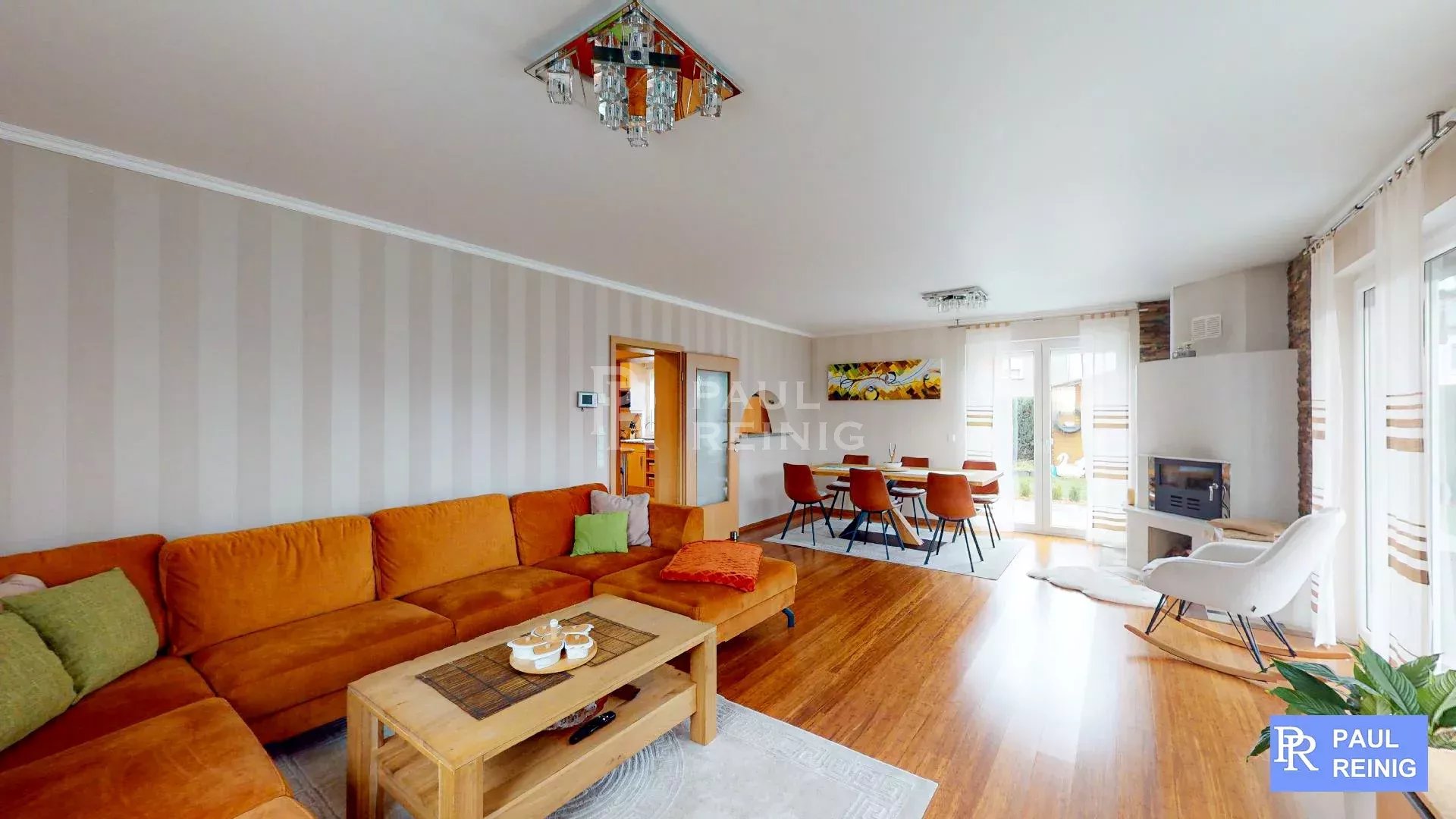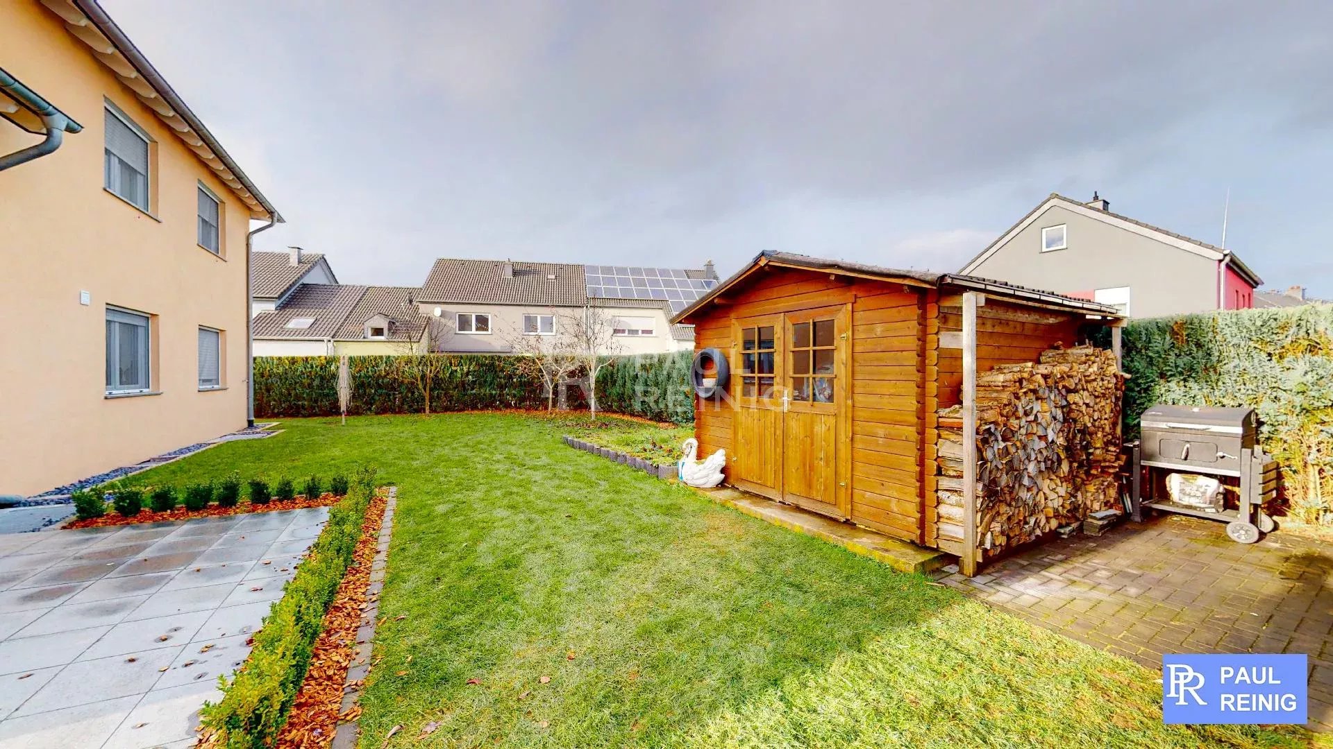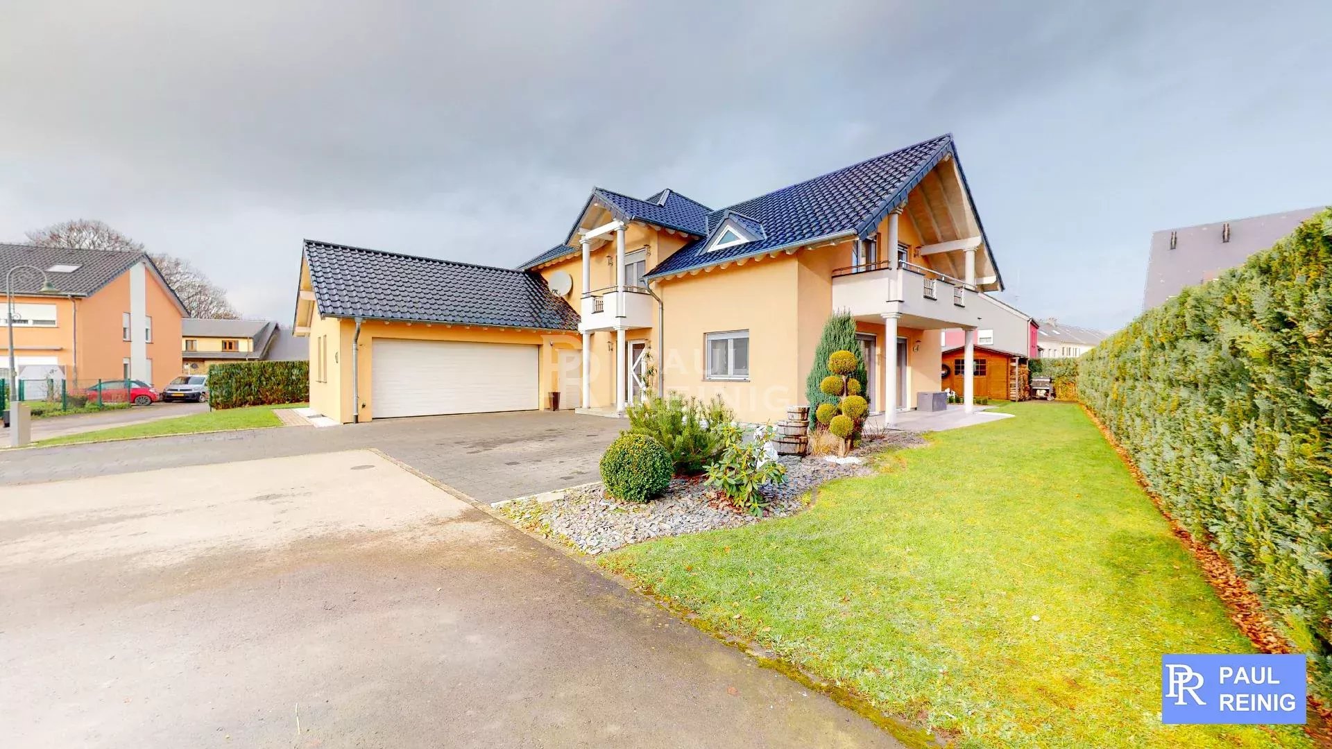 Erdgeschoss: Eingangshalle, Wohn- und Esszimmer mit Terrasse, Einbauküche mit Abstellraum und Terrasse, Büro, Duschraum, geschlossene Garage für 2 Autos;