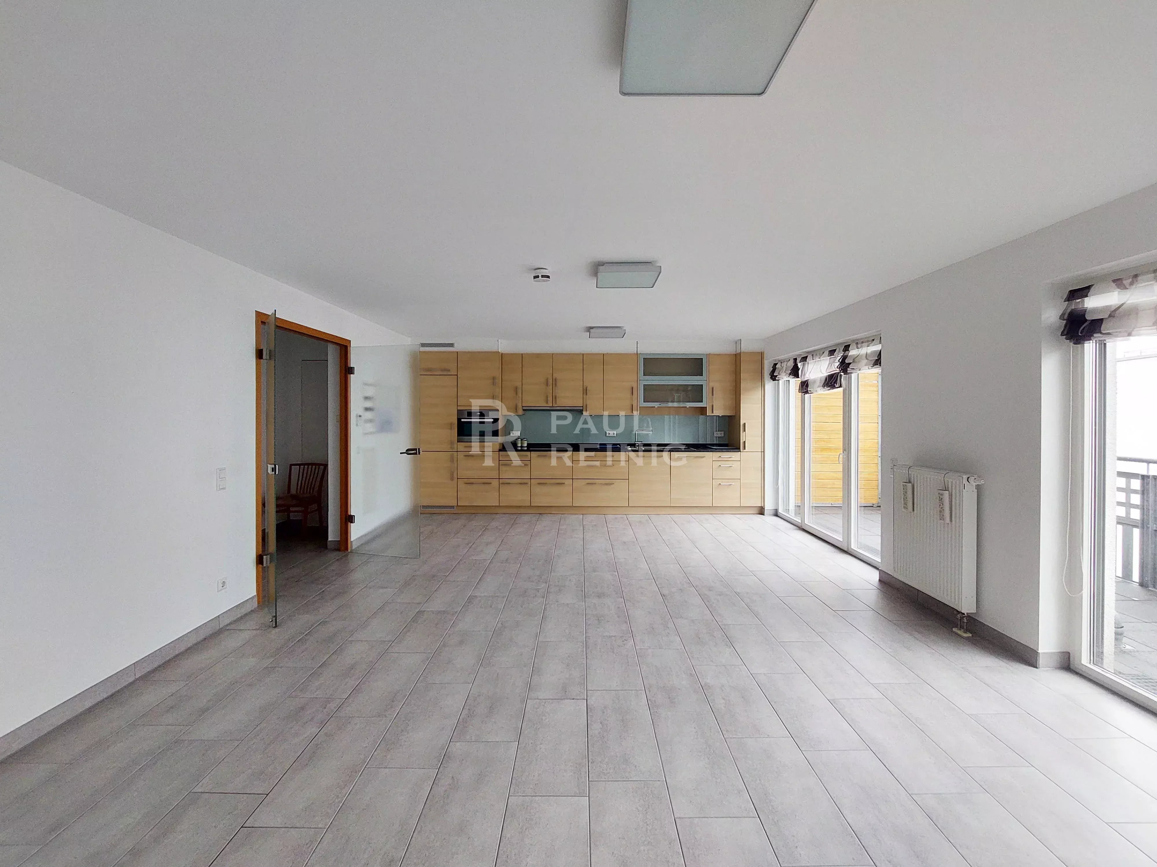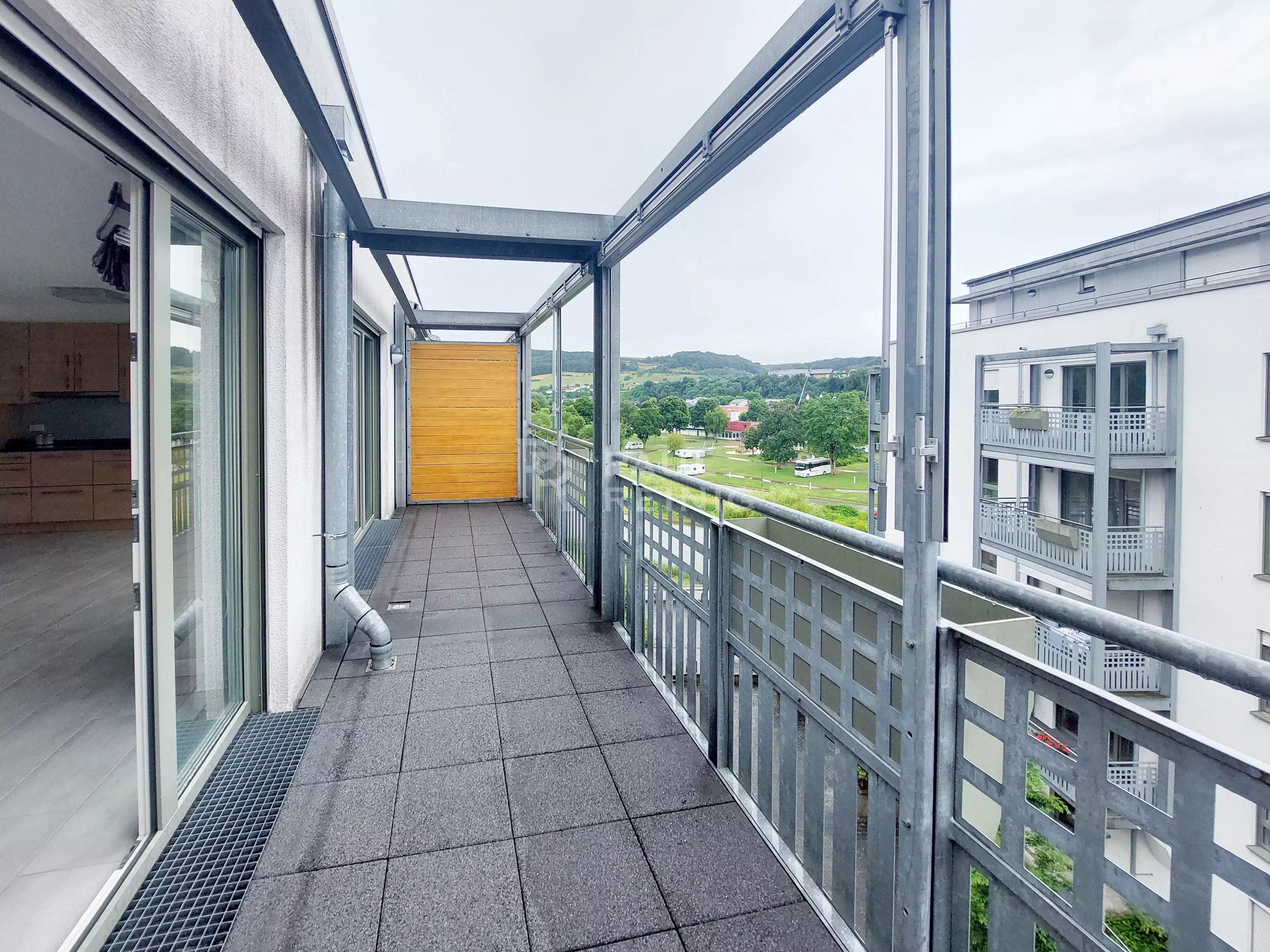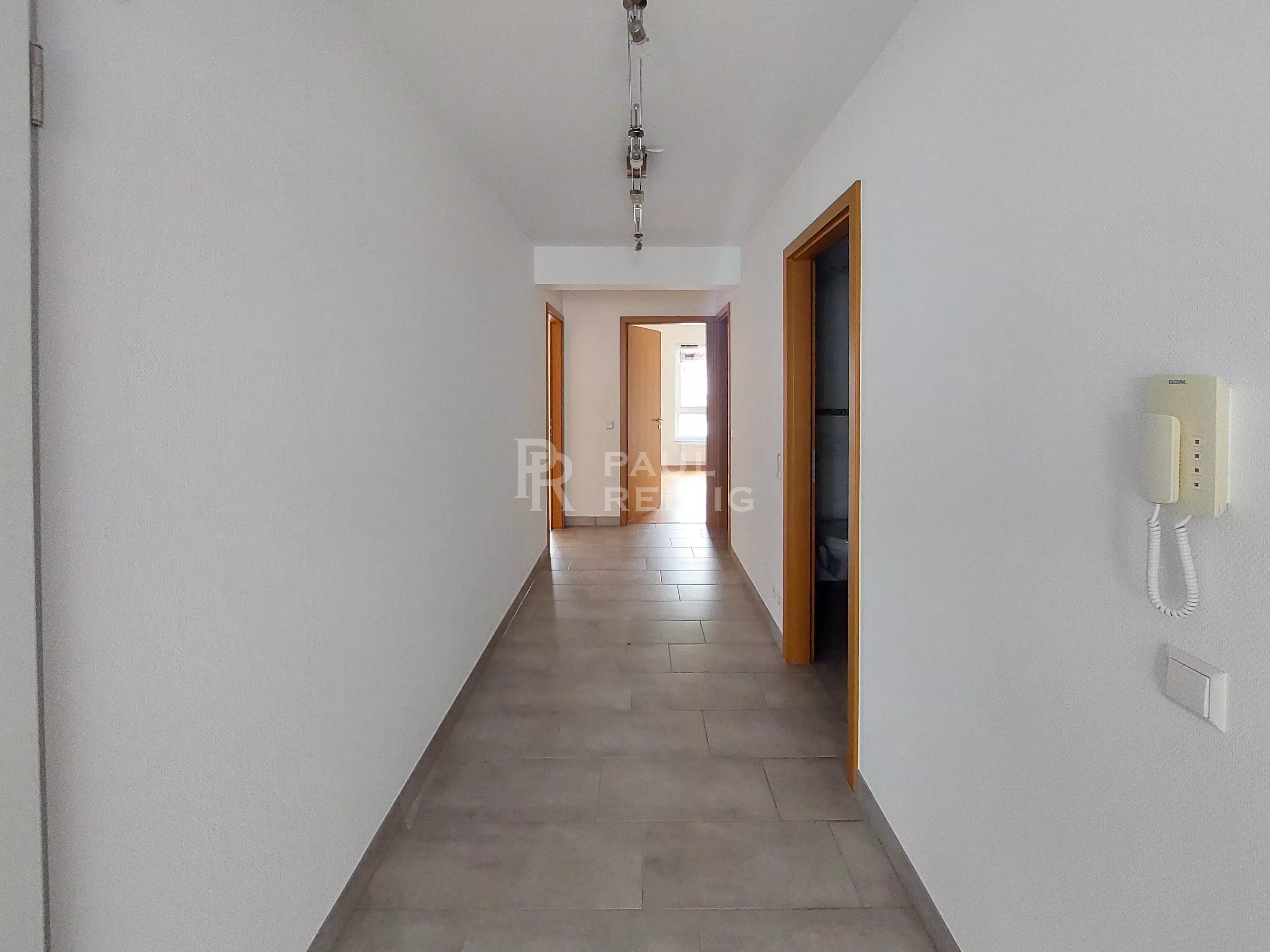 4. Etage: Eingangshalle, Wohnzimmer mit Einbauküche und Balkon, 2 Schlafzimmer, davon eines mit Balkon, Badezimmer, separates WC