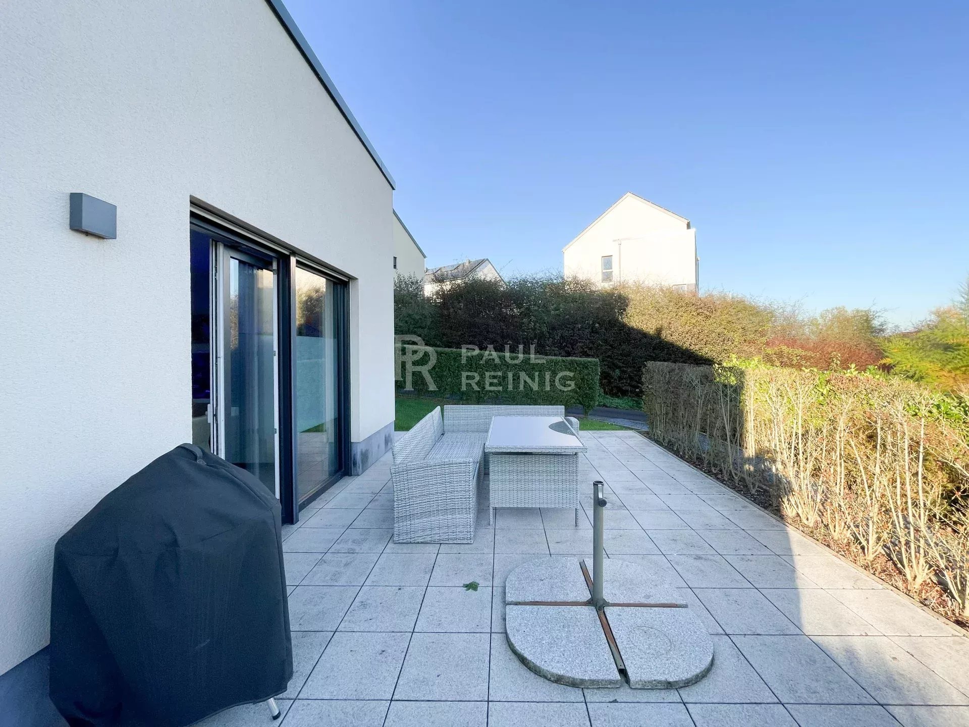 garden level: entrance hall, living room with fully equipped kitchen and large terrace of +/- 24 m2, 1 bedroom with bathroom, separates WC