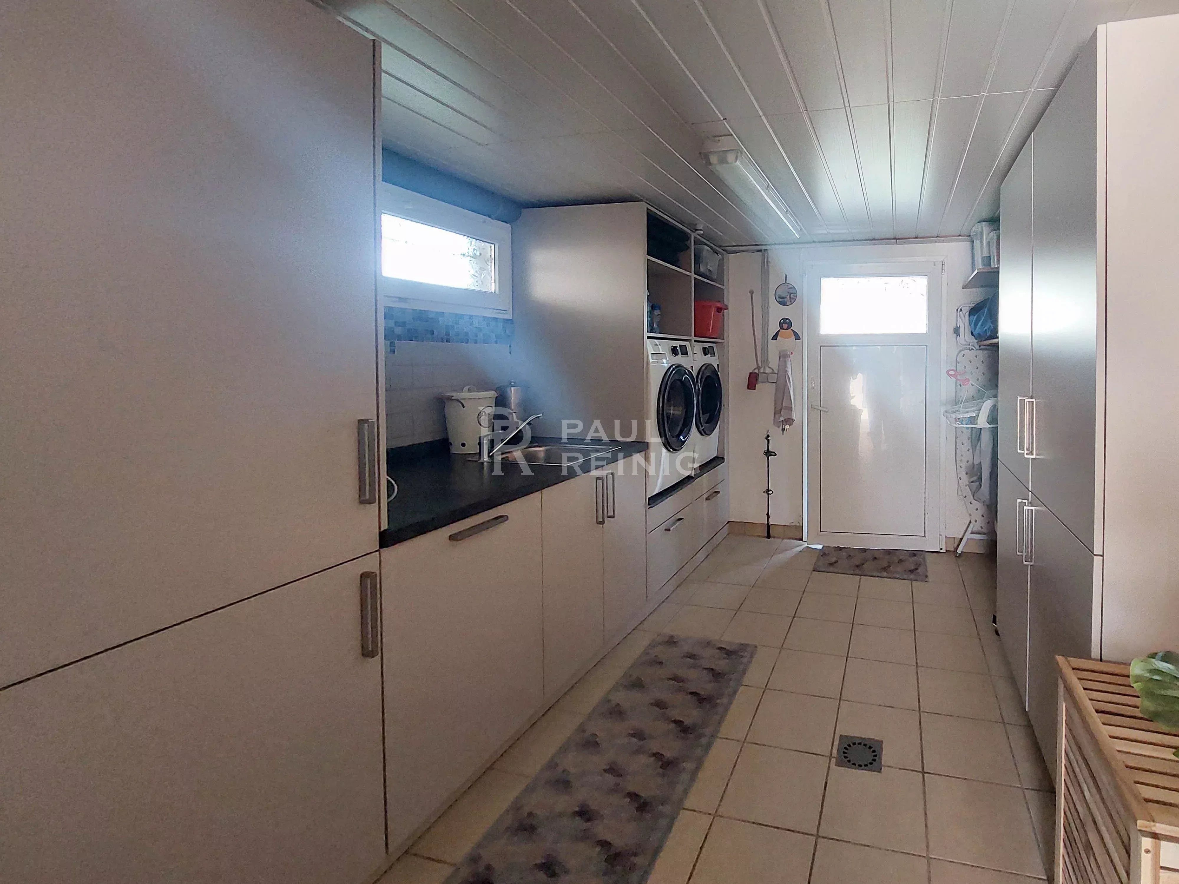 Ground floor: entrance hall, closed garage of 40 sqm, laundry room with cupboards, boiler room, storage room, terrace/lawn with barbecue
