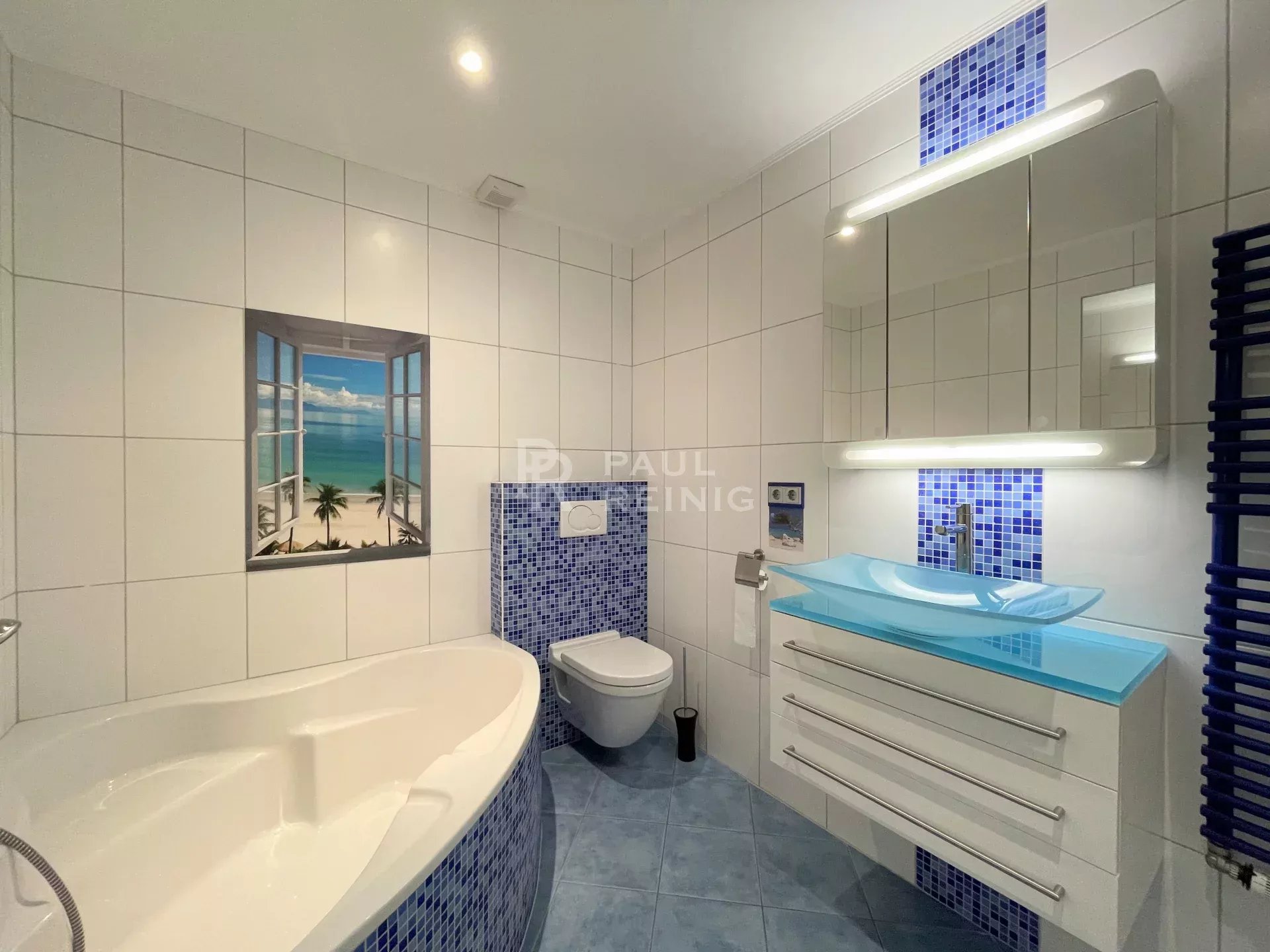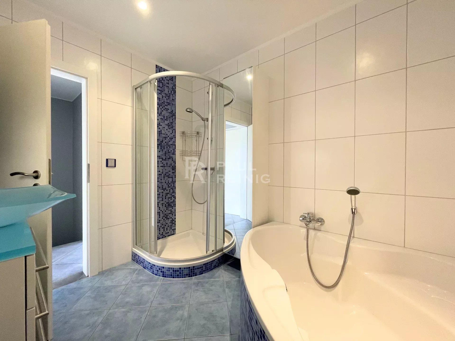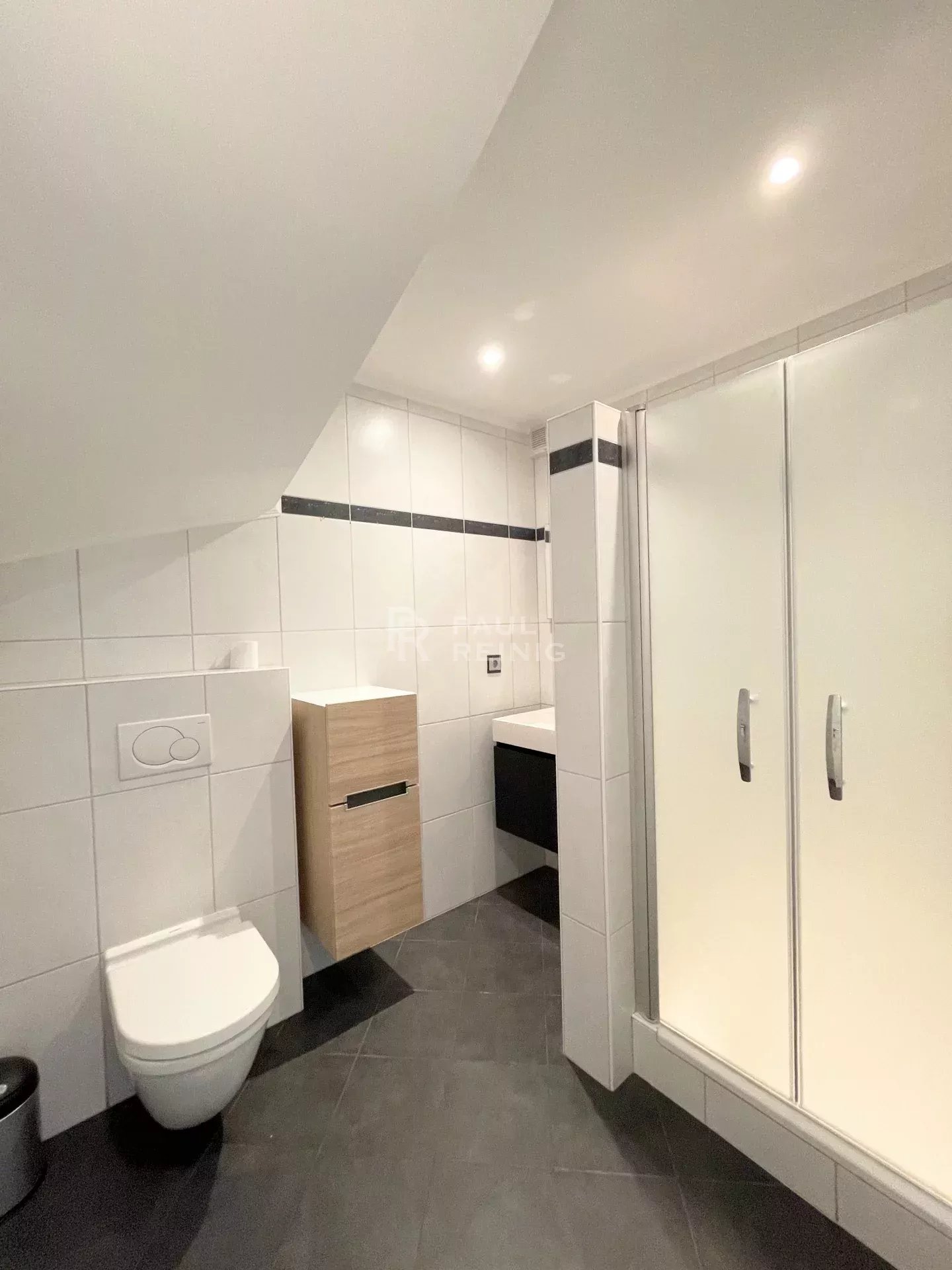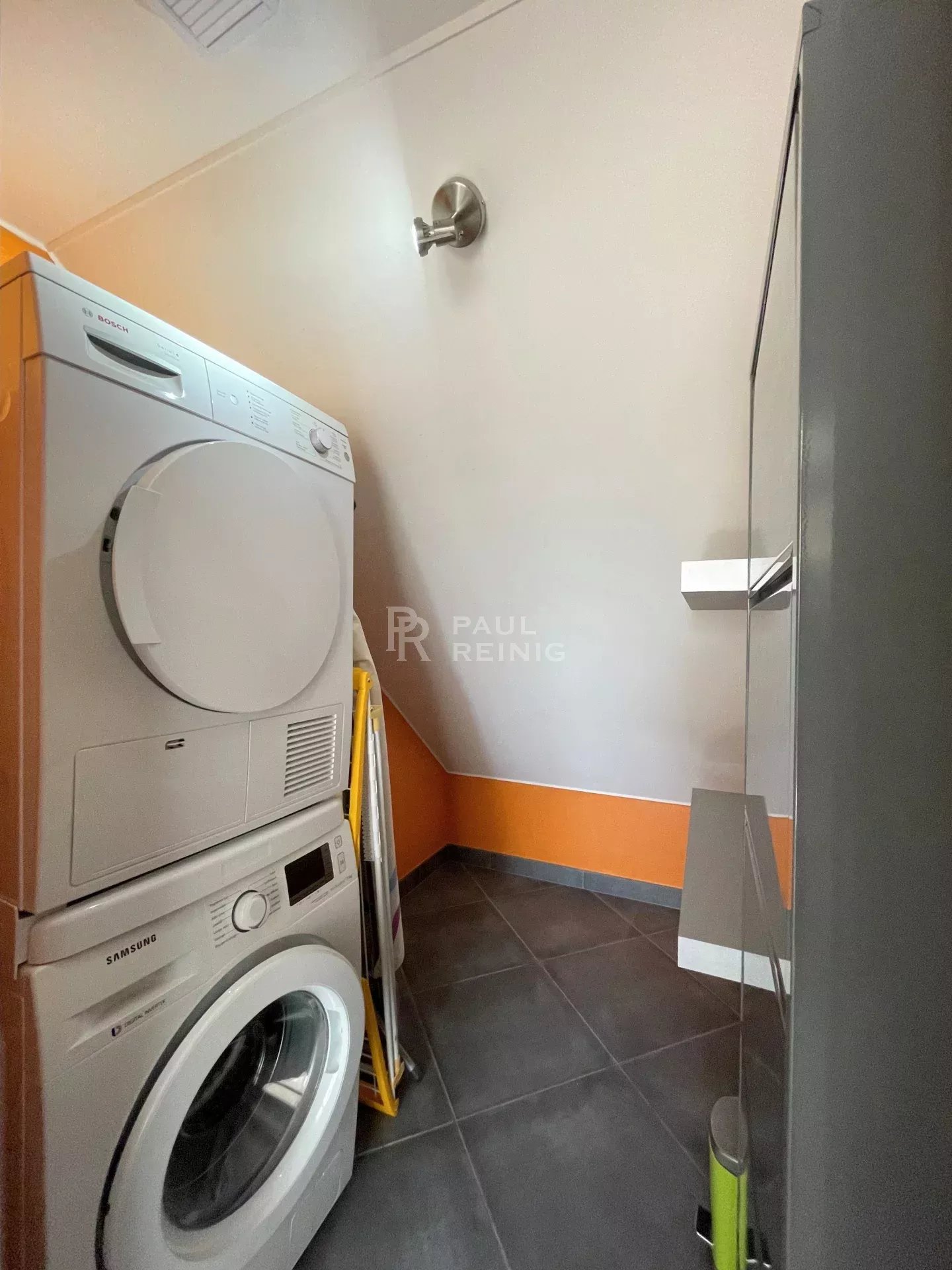 3e étage: 1 chambre à coucher avec armoire encastrée, salle de bains avec douche et baignoire, débarras/buanderie avec machine à laver et sèche-linge;