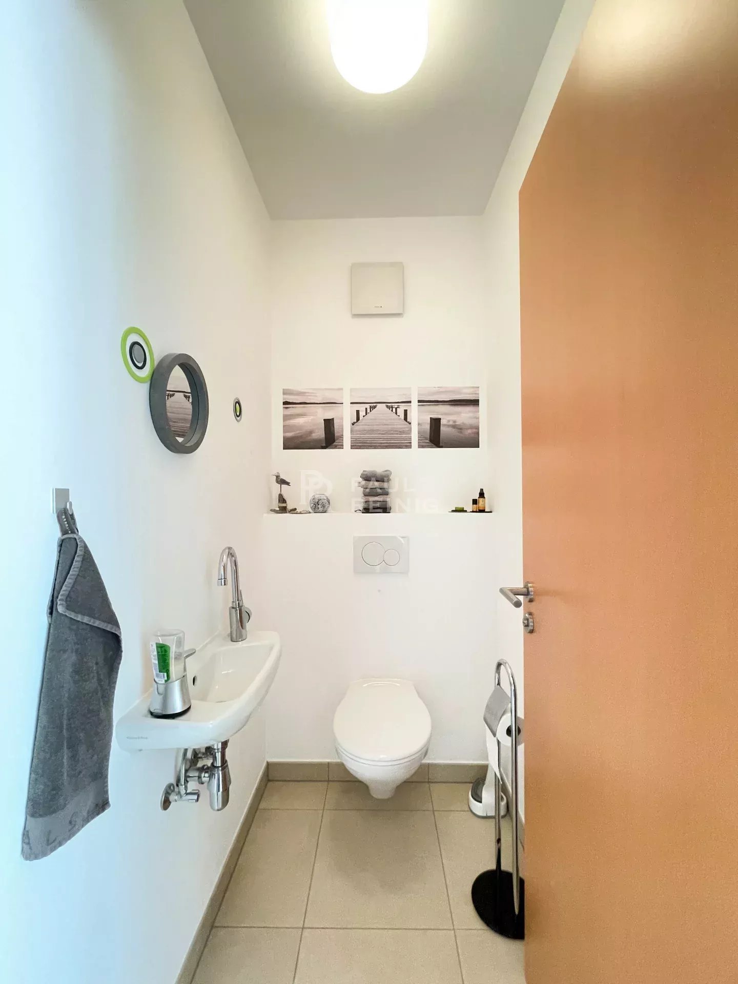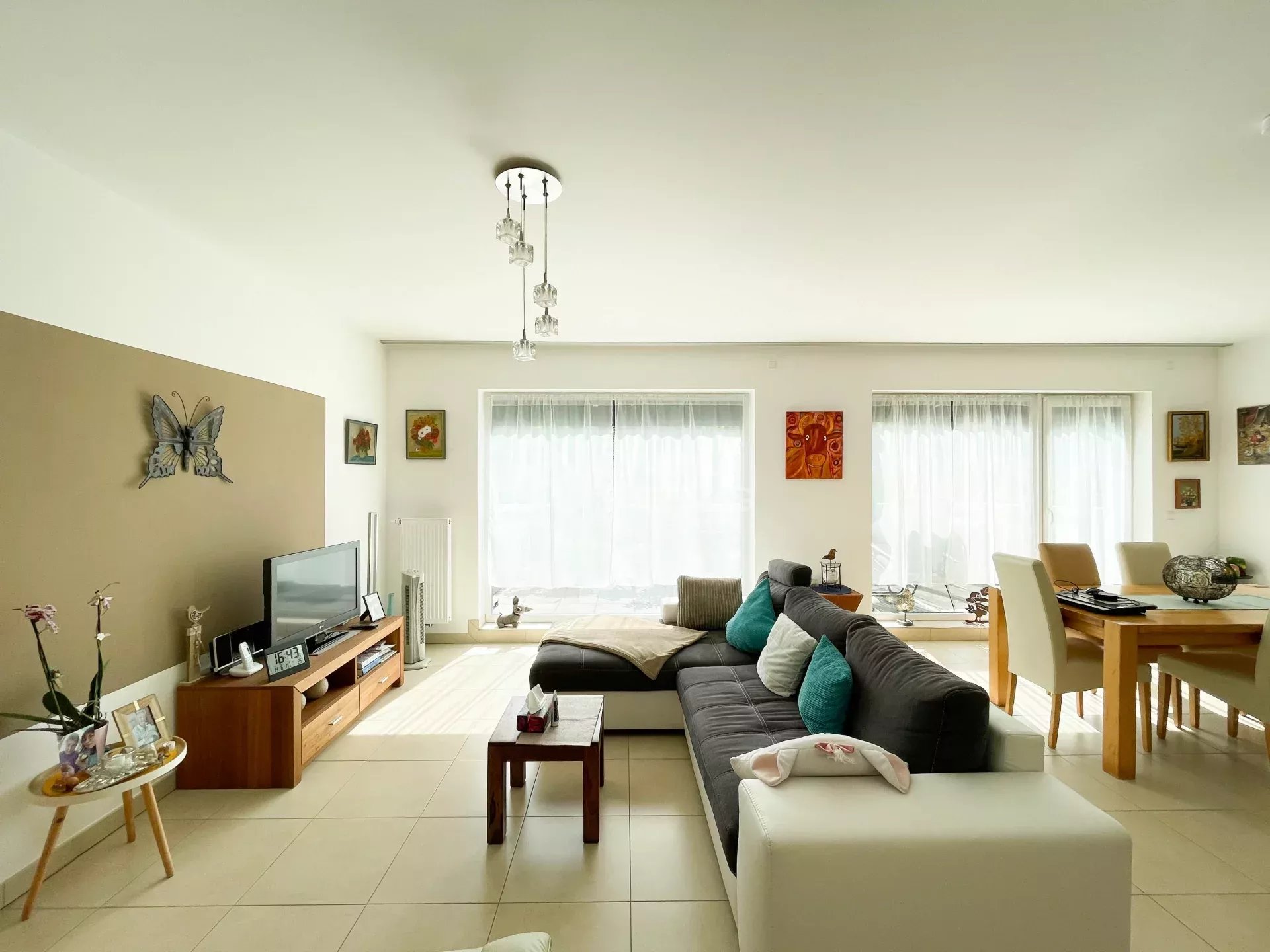 1er étage: hall d'entrée, living-salle à manger avec cuisine équipée et terrasse, 2 chambres à coucher, salle de bains, WC séparé