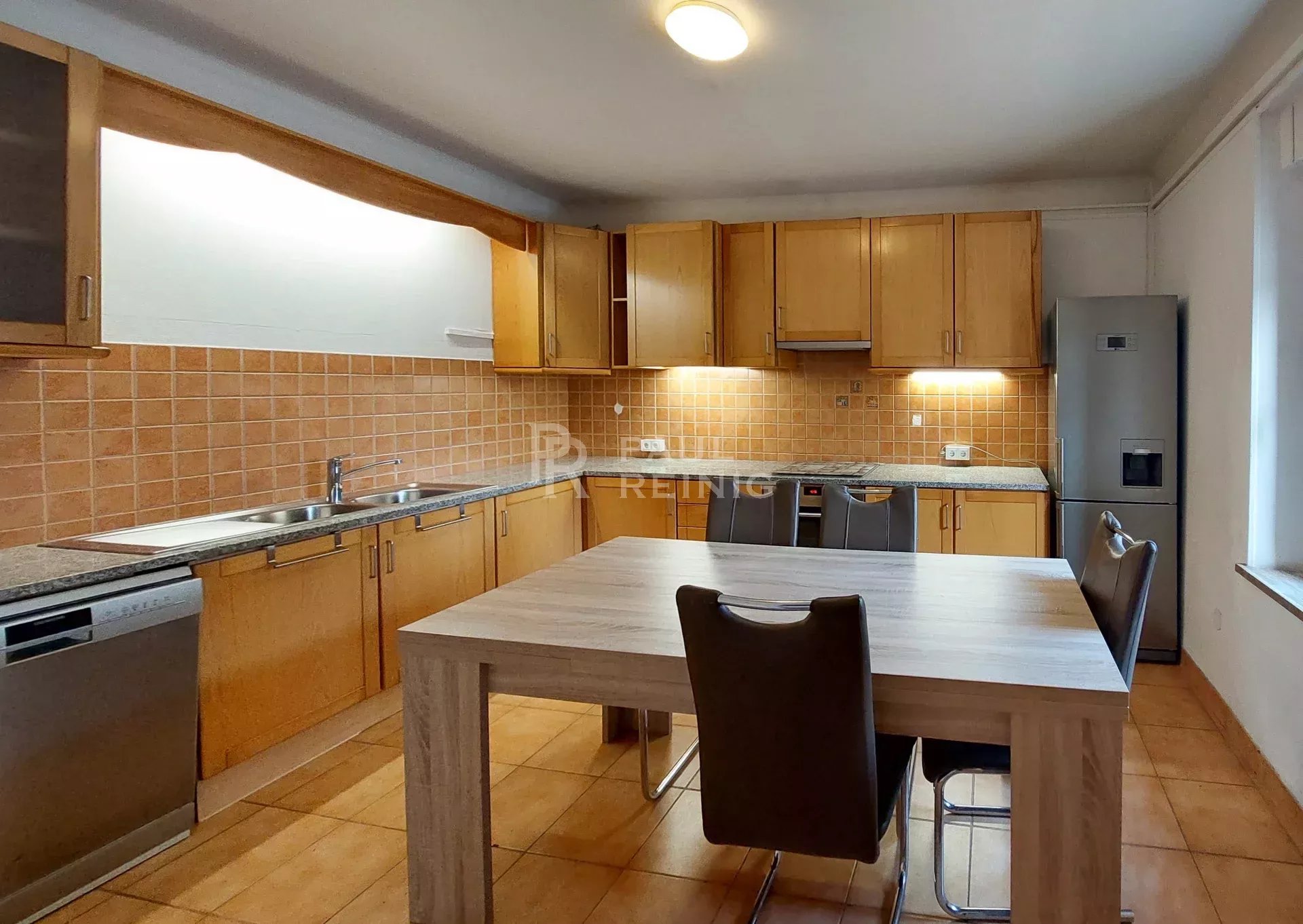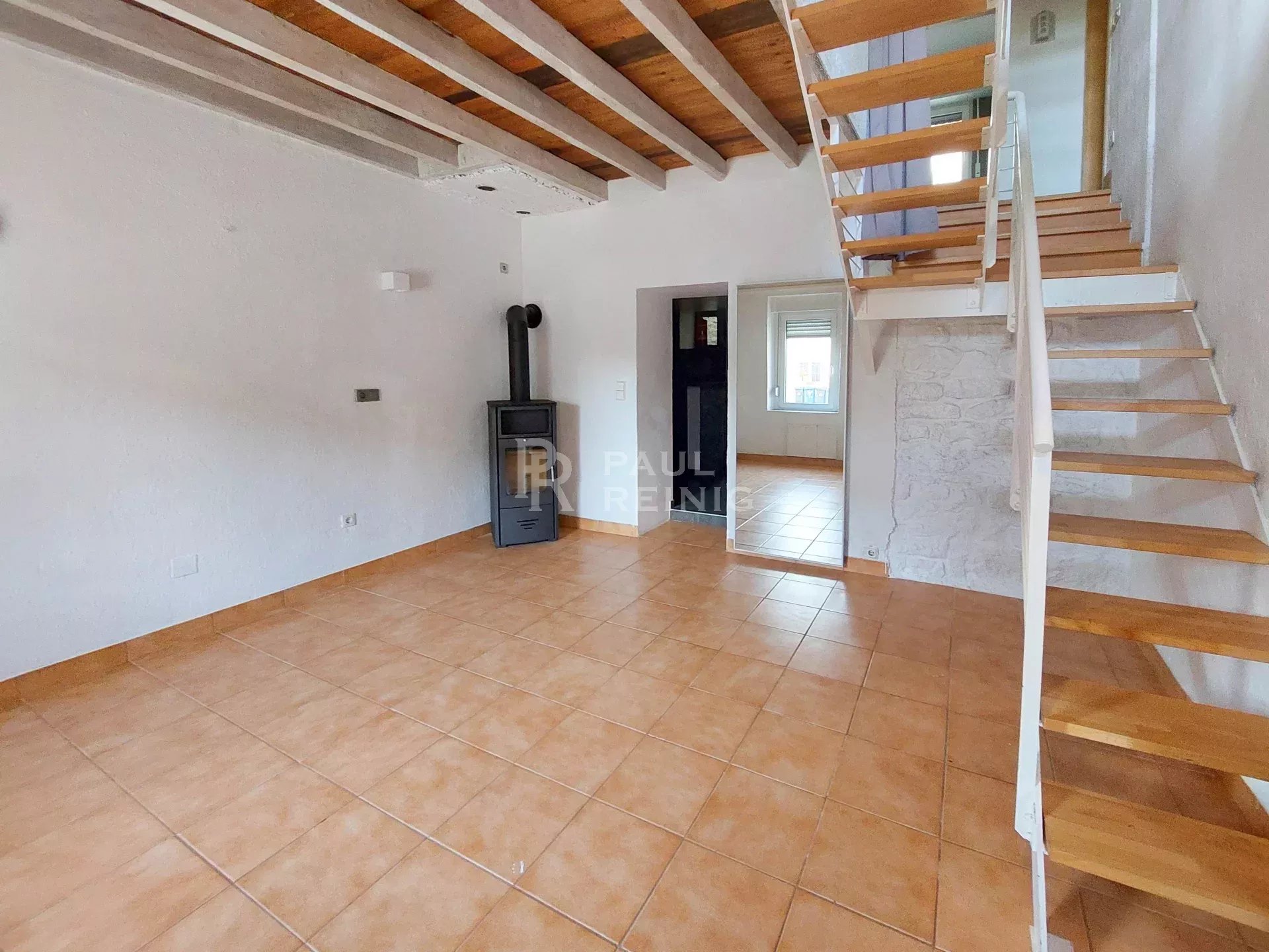 rez-de-chaussée: séjour avec poêle à bois, cuisine équipée, chaufferie, buanderie avec WC, terrasse, petit garage;